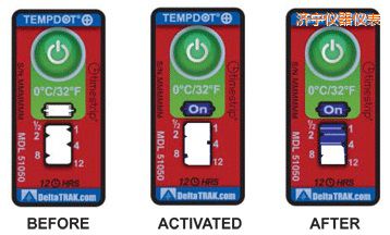 TempDot™Plus標(biāo)簽應(yīng)存儲(chǔ)在室溫下,并必須在反應(yīng)溫度閾值以上被激活。激活是通過用手指推壓。"On"字出現(xiàn)在第一個(gè)窗口中顯示激活。之后5分 鐘內(nèi),在反應(yīng)溫度或低于反應(yīng)溫度的情況下將標(biāo)簽貼到產(chǎn)品上。藍(lán)色染料熔化并以控制的速率遷移,,經(jīng)過白色大窗口。這表示暴露在溫度閾值以上的累計(jì)時(shí)間。當(dāng)溫 度低于閾值時(shí),該染料固化并停止移動(dòng)。如果溫度超過閾值,TempDot®Plus標(biāo)簽提供即時(shí)的視覺跡象。